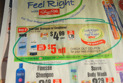 Big bargains this week: This week my shampoo and conditioner are on sale at Shoprite for $4.99 a bottle. If you buy two bottles you receive a $5 off coupon toward your next purchase. In addition, I had a $1.00 off coupon. So, end result; 2 (25 oz.) bottles of Pantene Shampoo and Conditioner for $3.99.