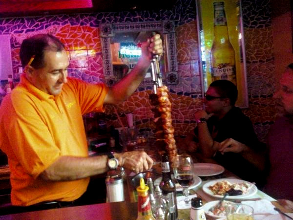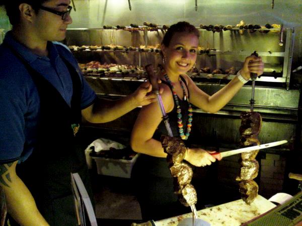 Recently, to celebrate some good news, my friends and I went to the Brasilia Grill on Monroe Street since the occasion called for a good “caipirinha” in a festive atmosphere. If you’ve never had one – try it; it’s the national cocktail of Brazil; loosely translated “caipirinha” means “of the mountains” – the American equivalent of “yokel” or “hillbilly” – or “redneck” which one surely feels like after drinking just one. After getting a little tipsy in the bar area, we moved to a small table there, opting to avoid the temptation of the free buffet and eat a little lighter, which is almost oxymoronic at a restaurant like this one. The cheerful and beautiful young Brazilian waitresses kept the male patrons smiling and – speaking for the women at my table – it was nice to see men working so diligently to cook and serve food.