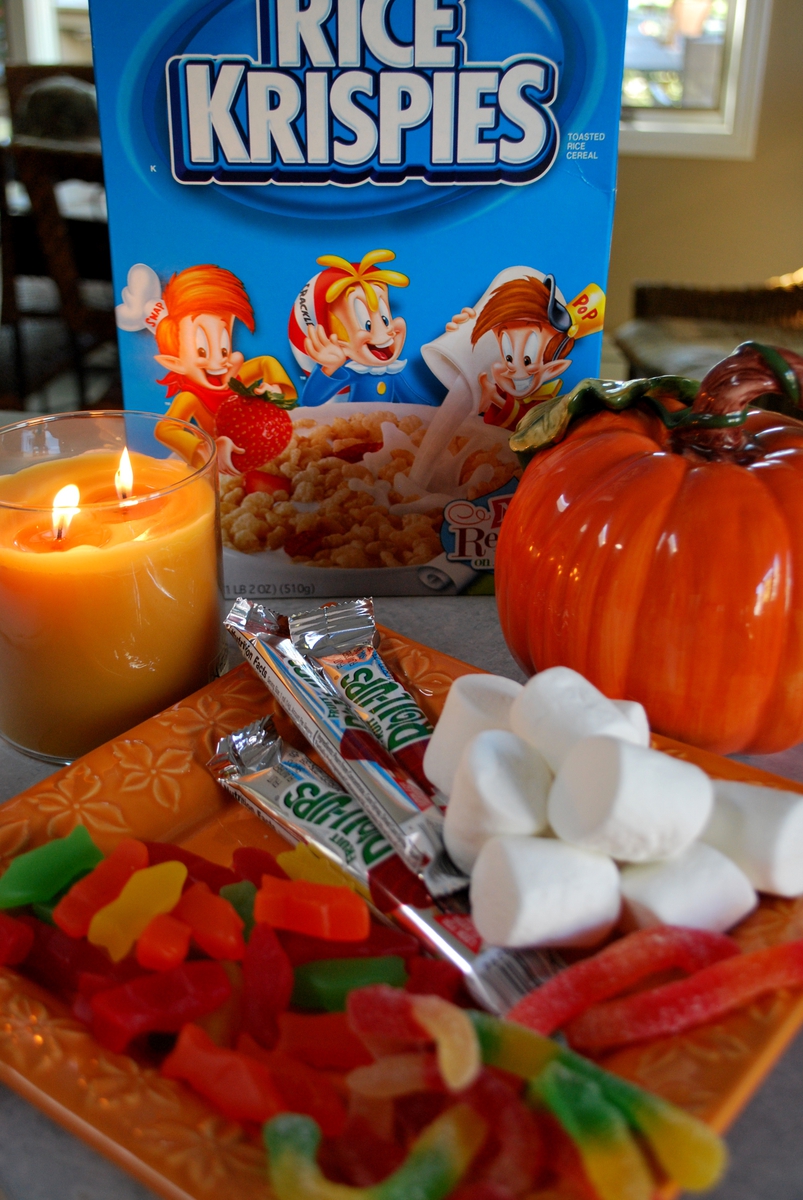 How about a Trick and a Treat this Halloween. While the gorgeous sushi selection you see above might look like it came from your favorite restaurant, it actually comes from award winning Chefs Snap, Crackle and Pop. Kids love the surprise when you calm their fears of eating raw fish for dinner with a sweet, chewy treat made with Kellogg’s Rice Krispies and Fruit Roll Ups. No, we’re not suggesting you serve these for dinnner, but they are really fun to serve your little Goblins after dinner or at a Halloween party.