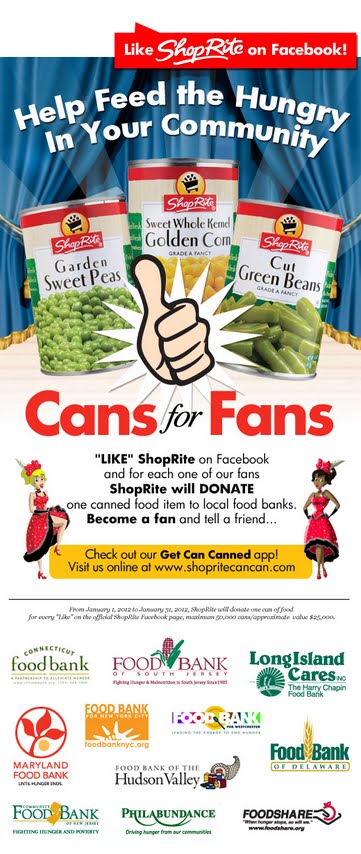 Now in its 41st year, the Can Can Sale has become extra special with the “Cans for Fans” Facebook program, which enables fans to get involved in the fight against hunger. During the 2012 Can Can Sale, January 5th through the 21st, ShopRite will donate one can of food (up to 50,000 cans) to local food banks in the communities it serves, on behalf of every new ShopRite Facebook fan.