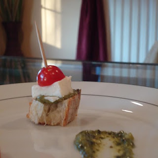 Assemble: Spread about 1 tsp of pesto on each top of bread, place cheese on top of that, then S & P, then the ½ cherry tomato, use toothpick to secure