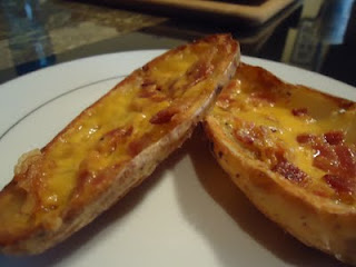 Take baking sheet out; crumble about 1 slice of bacon on top of each “skin”, sprinkle about 1 TBS cheddar on top of bacon, repeat with remaining “skins”, bacon, and cheese