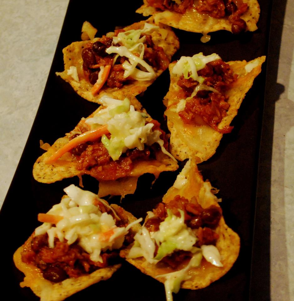 Use your favorite Pulled Pork recipe. Then load each individual tortilla chip with a spoon full of the pork and a little shredded cheddar. Pop them in the oven for a few minutes and then finish off with a dollop of cole slaw. Warning, they are highly addictive. Here’s my PP recipe. You could even use store bought in a pinch.