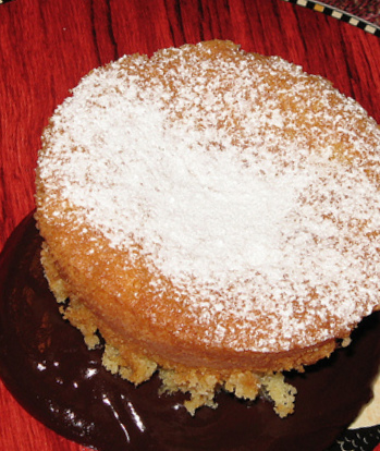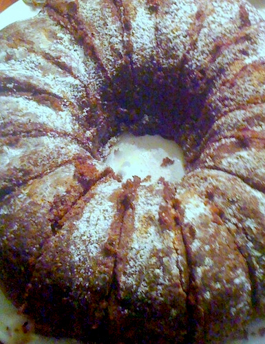 Bake cake until it springs back when lightly pressed with a spoon and is just starting to pull away from the pan, 50 to 55 minutes (Note-my oven runs warm so I baked for 45 minutes). Remove the pan from the oven and allow it to cool for 20 minutes. Run a long sharp knife around the edge of the cake and invert it onto a rack. Allow to cool 20 minutes more. Dust with confectioner’s sugar. Consume with friends.