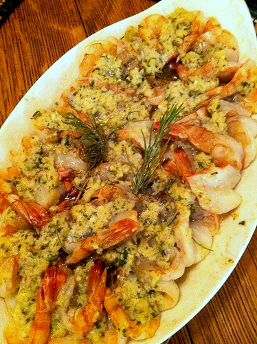 Starting from the outer edge of a 14-inch oval gratin dish, arrange the shrimp in a single layer cut side down with the tails curling up and towards the center of the dish. Pour the remaining marinade over the shrimp. Spread the butter mixture evenly over the shrimp. Bake for 10 to 12 minutes until hot and bubbly. If you like the top browned, place under a broiler for 1 minute. Serve with lemon wedges.