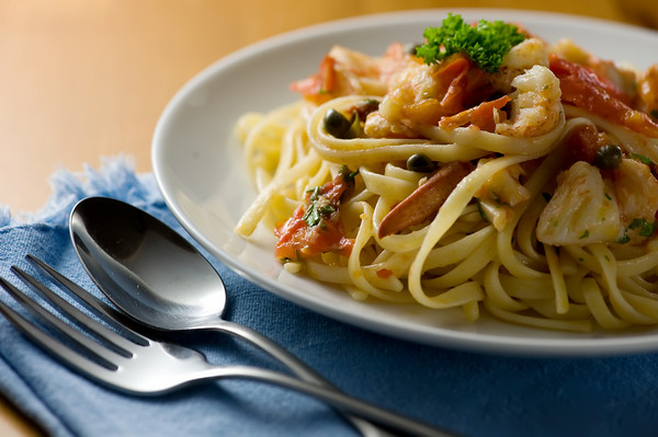 This delightful, delicious, de-lovely lobster dish is from the cookbook ITALY AL DENTE by Biba Caggiano. This is a quick and pretty sauce that called for tomatoes sauted in olive oil with garlic, sundried tomato, red pepper and (and this MAKES the dish) a handful of capers. Some lobster meat, a lacing of butter, some hot pasta, and your evening just got a whole lot better!