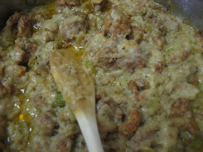 Adding all the stock at once. You don’t want the bread to be swimming in stock. Add a little at a time – ½ cup — so the bread can fully absorb the stock and there isn’t pool.