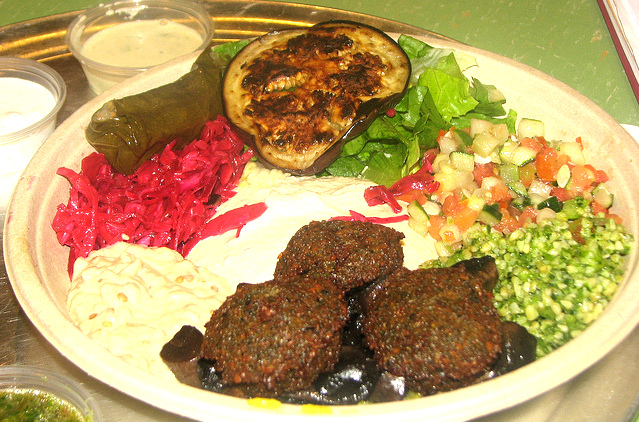 The setup is simple: you step up to the clean, nicely laid out counter and build your entrée step by step, choosing first whether you’d like a pita (white or wheat), plate, or “laffa” (essentially a wrap). Next you pick your protein from a selection of well-seasoned meats (chicken or steak), portabello mushrooms, falafel, or hummus. Then you shift over to the toppings and sides area to pick and choose from a range of delicacies including feta cheese, kalamata olives, tzatziki, dolmas, tabuleh, and a slew of garlic-, lemon-, and chili-infused house-made sauces.