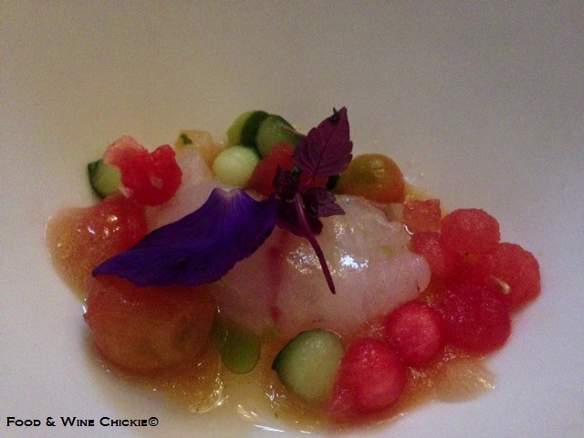 Fluke Crudo, Summer Melons, Heirloom Tomatoes, Garden Herbs