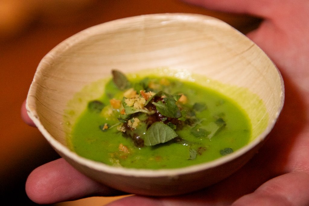 Escape – pea purée, bacon jam, ramp maple pistou, “petals and crumbs”