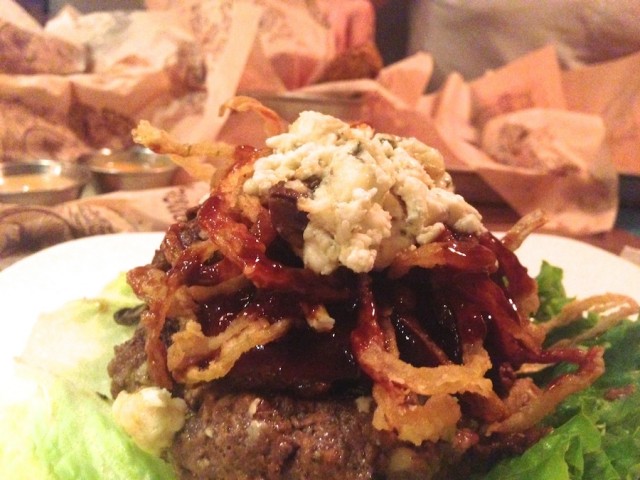 Recently my boyfriend, Nick, and I visited their only NJ location, at City Place on the Promenade in Edgewater. I was hoping to try ostrich, but unfortunately they were out of it, so we both opted for bison. The burger menu has a number of crafted combinations to choose from, or you can build your own. We both chose to go with one of the incredible combos: Me, a bison burger done rare with the Big Blue Bacon toppings (blue cheese, country bacon, fried onions, smokehouse sauce and and and bacon…wait for it…MARMALADE.) What? Amazing! Nick got the Roadhouse toppings: pepper jack cheese, country bacon, avocado, grilled onions, picante peppers and smoked paprika mayo. The burgers come alone – which is not to say you need a side, they are HUGE – but if you want to add a side there are so many to choose from. Fried pickles for me, and Nick tried the Parmesan panko crusted zucchini sticks. While I’m not a huge fan of bread-and-butter style pickles, the spicy crust did help balance out the sweetness. And the zucchini sticks were delicious and crunchy.