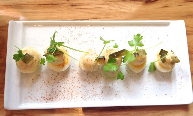 Our wine was opened and in lieu of the usual bread bowl, we crunched on beautiful puffs of rice. Luckily my sister and I have similar tastes so we were able to quickly select a few menu items to share: mini deviled quails’ eggs, pork belly salad, goat cheese cannelloni and the Mistral burger, which is served only at lunch.