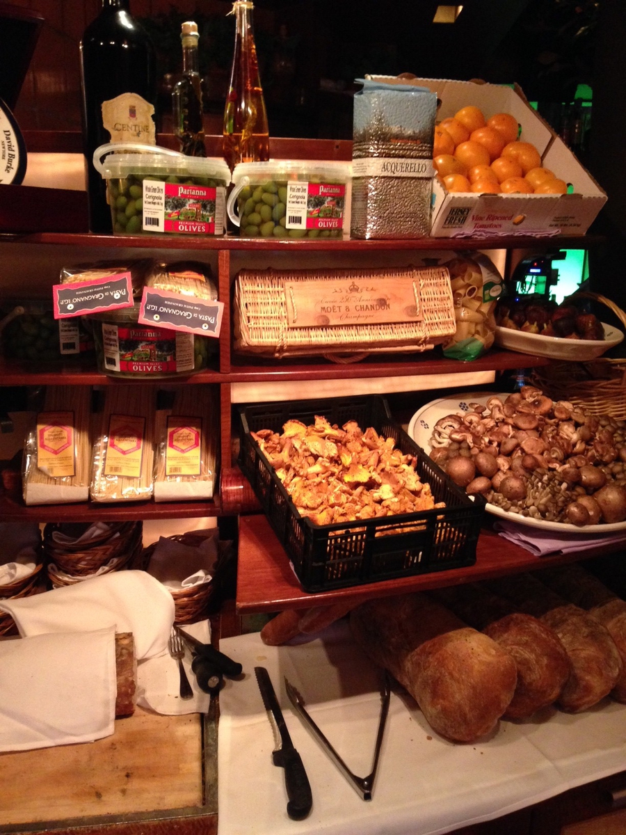 When guests first arrive, the focal point is the antipasto station showcasing all the favorites: salumi, a Parmigiano Reggiano wheel for fresh-carved chunks, roasted vegetables and bins of crusty Balthazar bread. There’s also a view of the open kitchen with its wood-burning oven.