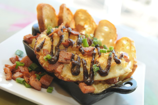 11. In a separate nonstick or very hot greased pan, cook the fried eggs for the topping. Let the eggs cook on one side and flip to lightly cook the other side – goal is to have a runny egg!