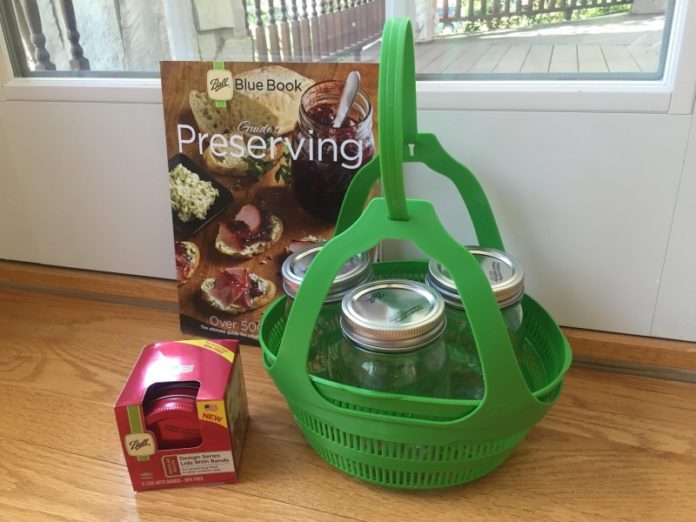 A few days later I received a box full of goodies: a Ball Canning Discovery Kit, Ball Blue Book Guide to Preserving, Design Series Lids in a beautiful red, and a container of Ball Fiesta Salsa Mix.