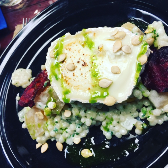 Of course, we could have made a meal of the Small Plates and Bites menu choices, but why do that when there was still so much wine to be consumed!? While we all enjoyed the plates we were served, three standouts were the expertly cooked rack of lamb, the pristine golden corvina fish over mushroom fennel rice and graced by a flavorful saffron coconut ginger nage, and a dish of delicata squash, pearl pasta, beets topped with the biggest slice of Bucheron cheese.