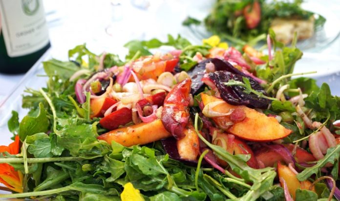 Then the dinner began, with one dish as gorgeous and as tasty as the next. Some of my favorite dishes included purple mashed potatoes with caramelized onion, a pasta starring goat cheese, and arugula salad with peaches, fennel, beets and a citrus vinaigrette (pictured at top). And of course I can’t forget the sweet ending that included a perfectly picked peach paired with ricotta with lemon verbena.