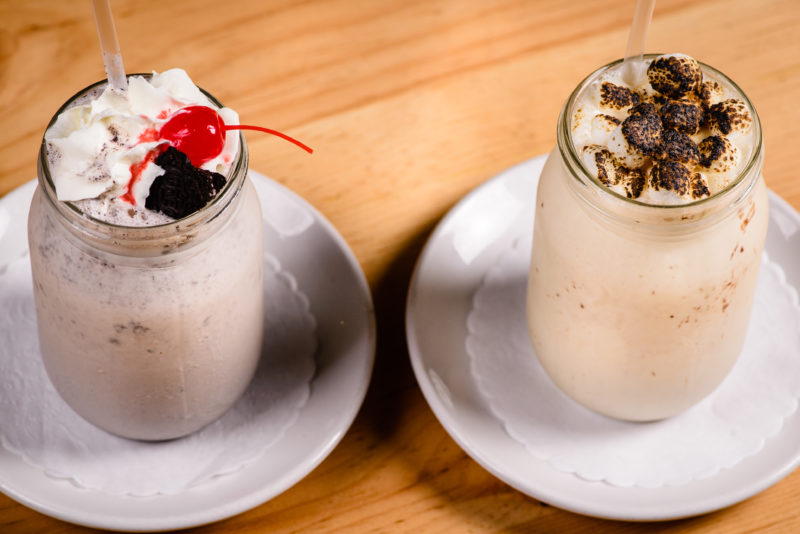 We ordered a real classic, the bacon cheeseburger. The six-ounce angus beef burger has hickory smoked bacon, and aged cheddar served on a pretzel bun. The shrimp po boy offers the fine, authentic taste of the Big Easy with beer-battered shrimp, remoulade, and sharp cheddar served on focaccia with cole slaw. Each entrée comes with a side. We enjoyed a serving of the light, tasty sweet potato fries and the truffle mac and cheese. The Reese’s Peanut Butter Cup shake and root beer were ideal choices to accompany our meals.
