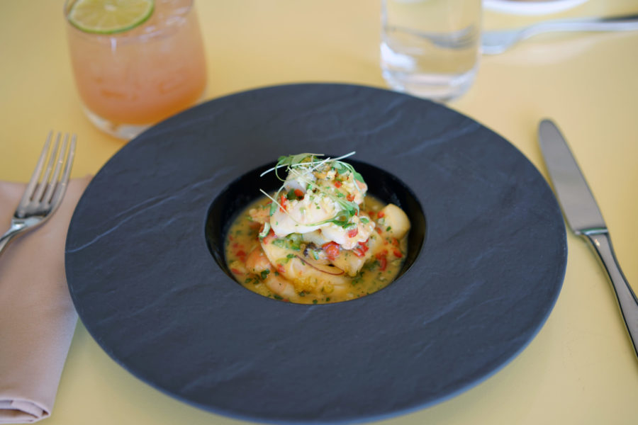 Both a Wagyu skirt steak–sliced to share and simply garnished with sea salt—and a whole branzino were wood-grilled and accompanied with a spicy ancho chili sauce. Garces’ nod to the Jersey Shore includes classic crab cakes, jumbo fried shrimp, and surf and turf.