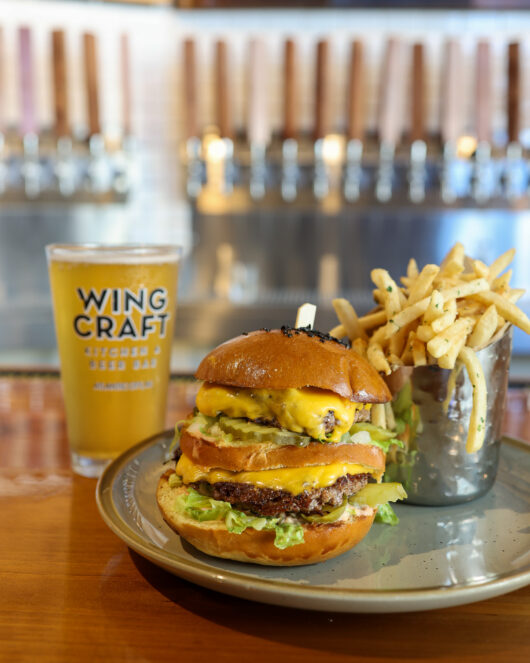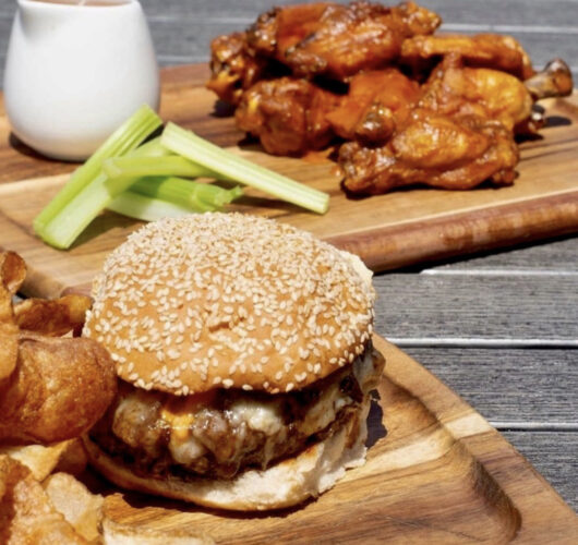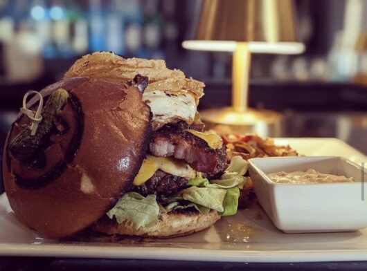 Old Glory Kitchen and Spirit‘s Bison Burger uses 10 oz. of ground bison, Wisconsin cheddar, frizzled onions, bacon, and homemade steak sauce to finish this beefy burger.