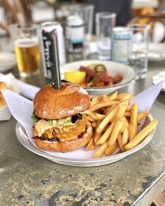 A popular on the Island, The Oyster House Dry Aged Burger with smoked paprika potato straws, Muenster and cooper sharp cheese, nduja aioli, lettuce, and chipotle ketchup.