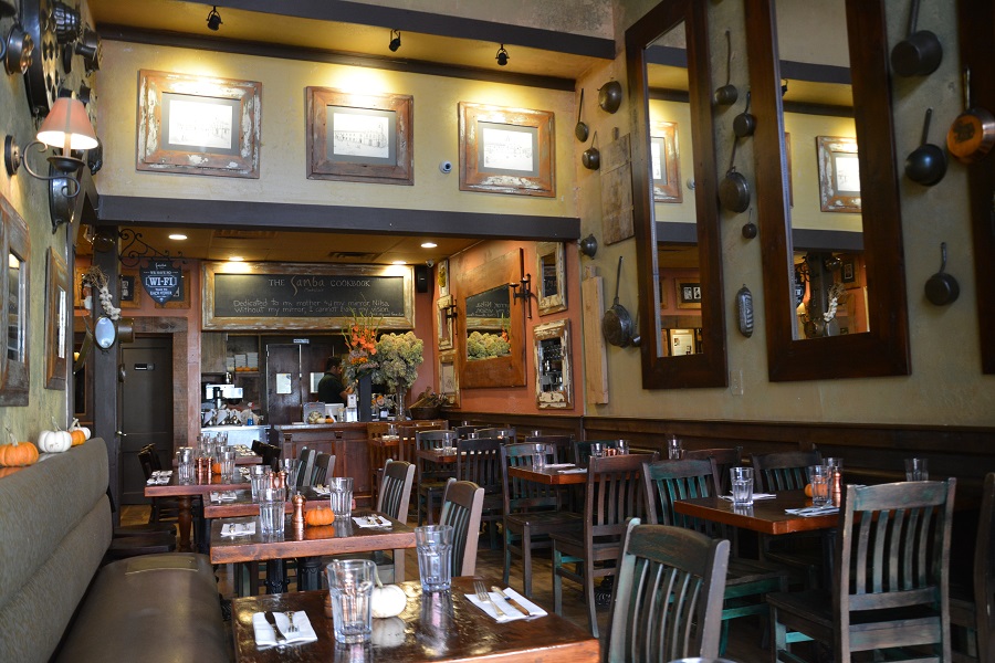 The restaurant’s high-ceiling interior reflects Gonçalves’ sensibilities and taste. The towering walls feature warm earth tones and a collection of mirrors and drawings displayed with weathered, rough wooden frames, along with a decorative ensemble of wooden cutting boards and brass pans, molds, colanders, and ladles.