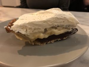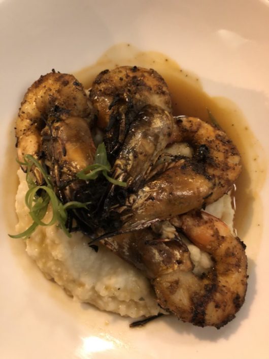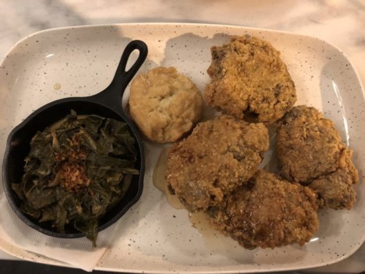 Next up was the Carolina BBQ shrimp and grits, complete with head-on shrimp and 50/50 grits. The heavily blackened pieces of shrimp were flavorful and not a second overcooked, piled high on a hot bed of creamy and textural grits. (You could actually chew them instead of slurping them down.) My date chose the vegan fried chicken… yes, you read that correctly. (It’ll fool anyone for a minute. When I brought it home to my husband, he devoured a piece before realizing that it wasn’t actually chicken.)