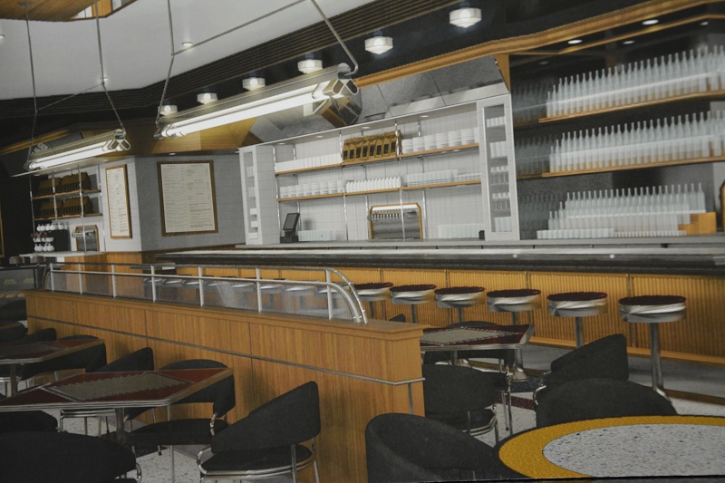 The spacious interior will house a long counter with 15 round swivel stools, decorative lighting, stainless steel trim, wood panels and a beige earth-tone color scheme, and—most impressive—an authentic, poured terrazzo floor. Many vintage, factory-built diners from the 20th century had elegant, speckled terrazzo floors. Unfortunately, most modern site-built diners refrain from including terrazzo floors, mainly due to cost considerations.