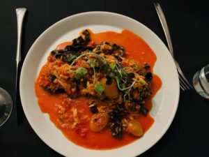 For an appetizer, we chose the charred octopus served with pickled bell peppers, onions, and fried slices of fingerling potato. Our waitress explained that the the chef prepares the octopus in a sous-vide water bath earlier in the day. The charring happens upon ordering. Beautifully presented, the octopus was both perfectly charred and perfectly tender. The sprinkling of pickled peppers and onions created a balanced, tart-acid bite. This offset the rich seafood, while the fried fingerling potatoes added texture; the mustard wine sauce a bit of mellow heat and creaminess. If you have ever been disappointed by mediocre octopus this might be the redemption dish you were looking for!
