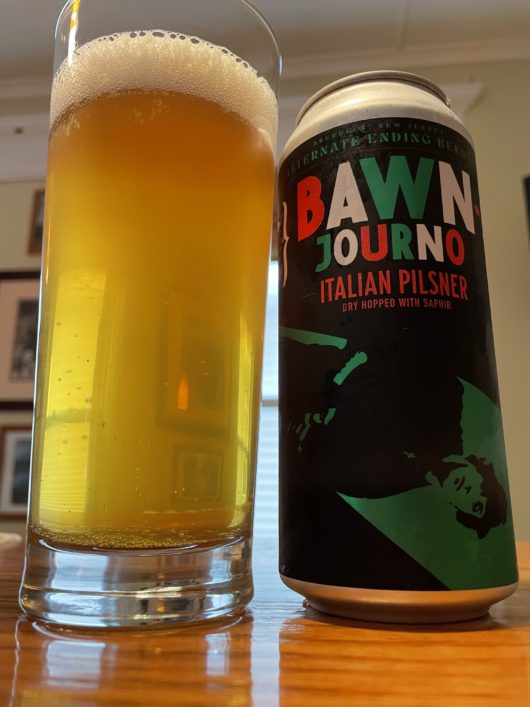 What better way to escape the dog days of summer than in a cool dark movie theater? Alternate Ending Beer Company is a brew pub located inside an old cinema. The team plays up the movie theme in a fun and entertaining fashion. Bawn-Journo is an Italian pilsner, basically an unfiltered pilsner style beer that’s  dry hopped with earthy and herbal European noble hops. It goes perfectly with pizza (Alternate Ending makes great pies) and mob movies but can stand up on its own as well. Capisce?