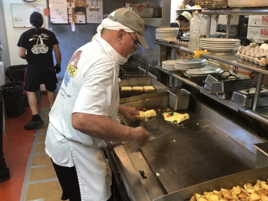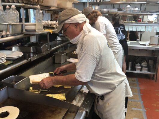 This reporter was granted entry into the diner’s kitchen to observe the grand master in motion. Smith was folding an omelet — one of thousands he’s made — gathering ingredients, twisting, turning and whirling, wielding his spatulas with surgical precision.