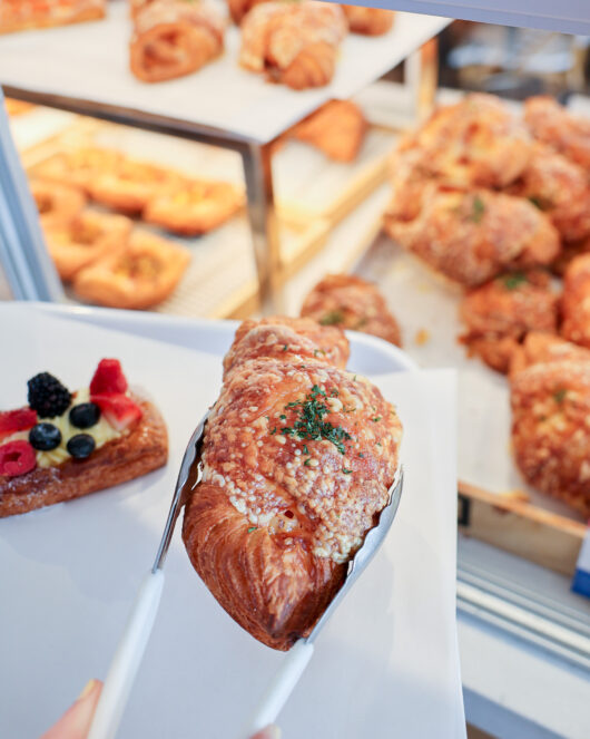 A unique feature of Paris Baguette is its self-serve setup. When you walk into the bakery, you grab a tray, some wax paper, and walk down the aisle of pastries to choose the items that speak to you. “You self-serve and start building a pyramid of stuff — beautiful croissants that are just wonderful, the pastries, and more,” says Mele.