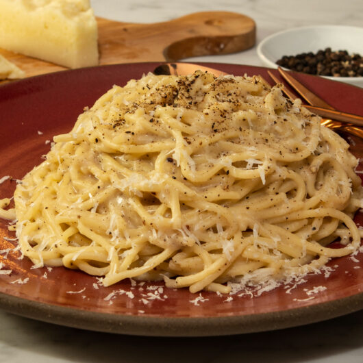 This classic Roman pasta dish has a cult following for a reason! It uses just three ingredients; pasta, Pecorino Romano cheese, and pepper. This combination creates a creamy, luscious, and amazingly flavorful cheese sauce that beautifully coats thick-cut bucatini. My easy, speedy, one-pan version cleverly uses the starch from the pasta cooking water to create thick and luxurious results.