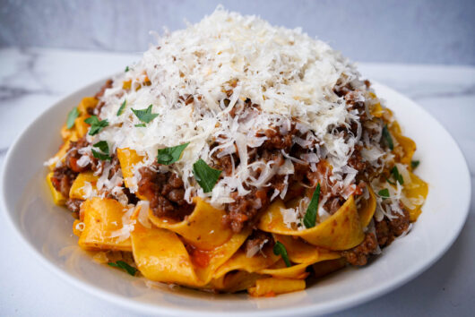 This beloved meat sauce is from Bologna, the capital city of the Emilia Romagna region of Italy, also often considered Italy’s food capital. My version features tender ground lamb simmered in a flavorful red wine-tomato sauce with Grana Padano or Parmigiano Reggiano cheese. Serve this hearty sauce over thick-cut pappardelle or tortellini.