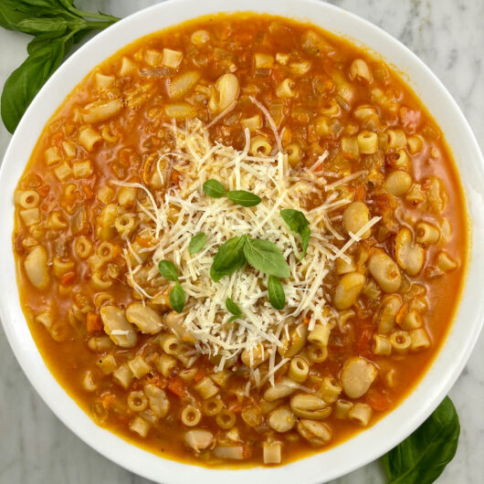 My grandma’s “Pasta Fazool” was my number one favorite comfort food dish when I was a little girl! Fun fact: fazool really fagioli, which is Italian for beans. On menus, you might see it listed either way. This dish is served all throughout Italy with either cannellini or Ceci beans, aka chickpeas. You can make this thick, one-pot, pasta-based soup in under 30 minutes. It’s a family-friendly crowd pleaser!