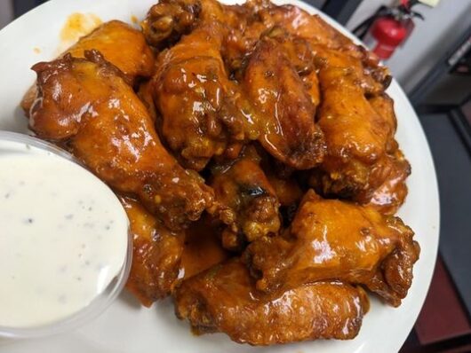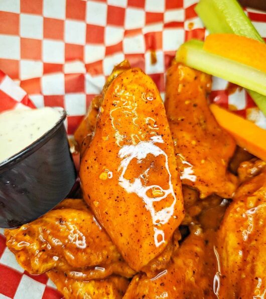 If you’re in the Middlesex area, take note: Ellery’s Grill offers boneless and bone-in options, both served with celery and blue cheese. Have them tossed in your choice of sauce: BBQ, Ellery’s house buffalo, buffalo garlic, sweet Thai, or teriyaki.