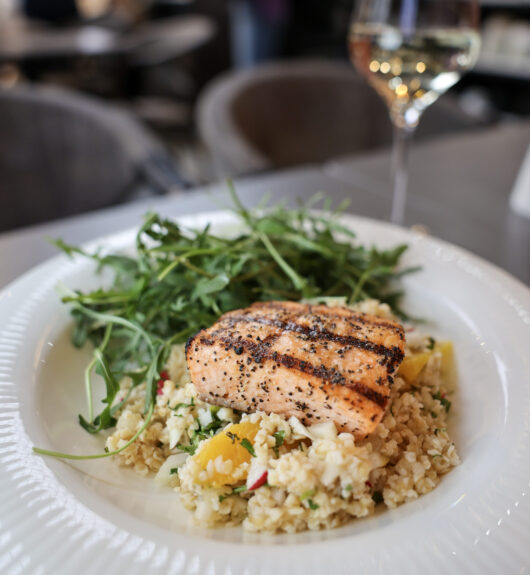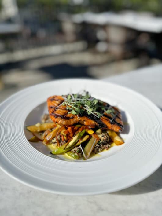 For lighter fare, try the strawberry salad. Made with spring mix tossed in balsamic vinaigrette and topped with walnuts, feta cheese crumbles, and fresh strawberries, you can add chicken or salmon for an extra boost of protein.