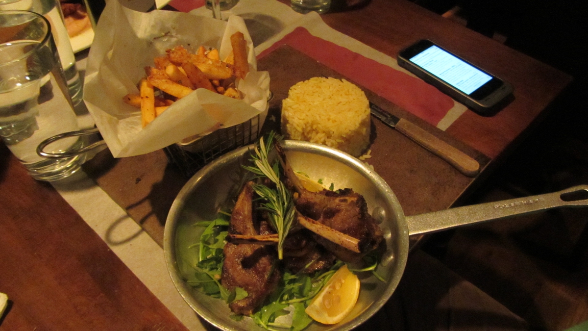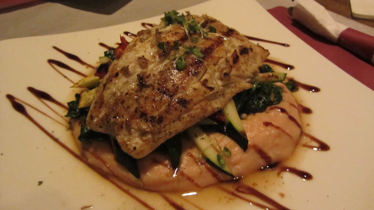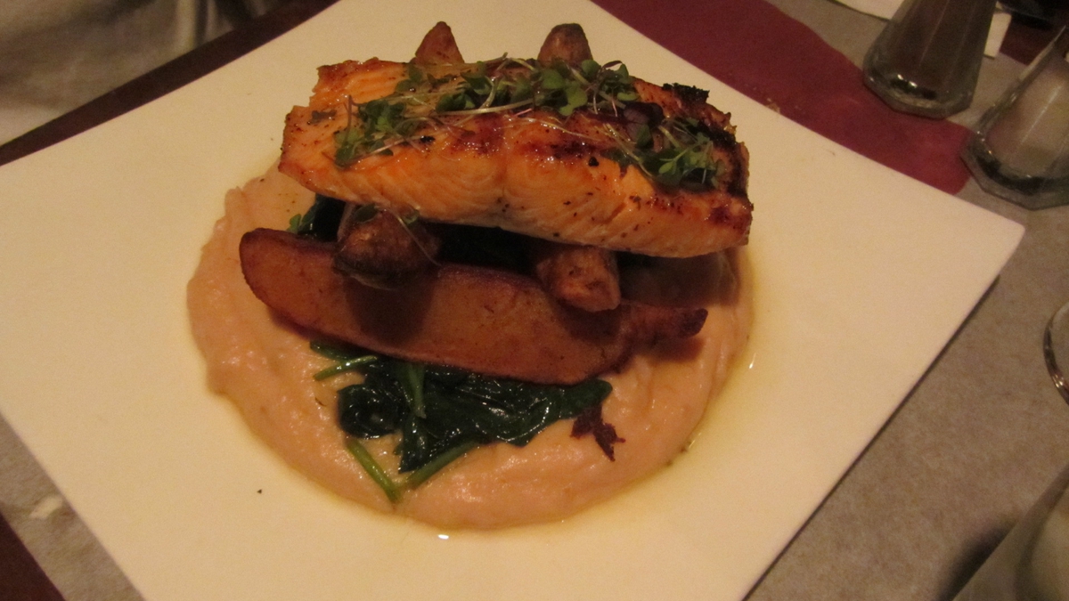 We ordered the arctic char, the salmon, and the sea bass specials. Each was served a bit differently, either with rice or roasted potatoes and spinach or with grilled vegetables over the most delicious mashed potatoes infused with beet and feta. Creamy and wonderful, beautifully presented as you can see with a balsamic glaze. The lamb chops were also a special that night, and my friend wanted french fries and rice. Hearty portion; he loved them. He also raved about those sardines. Even the chef’s vegetables are wonderfully cooked and presented.