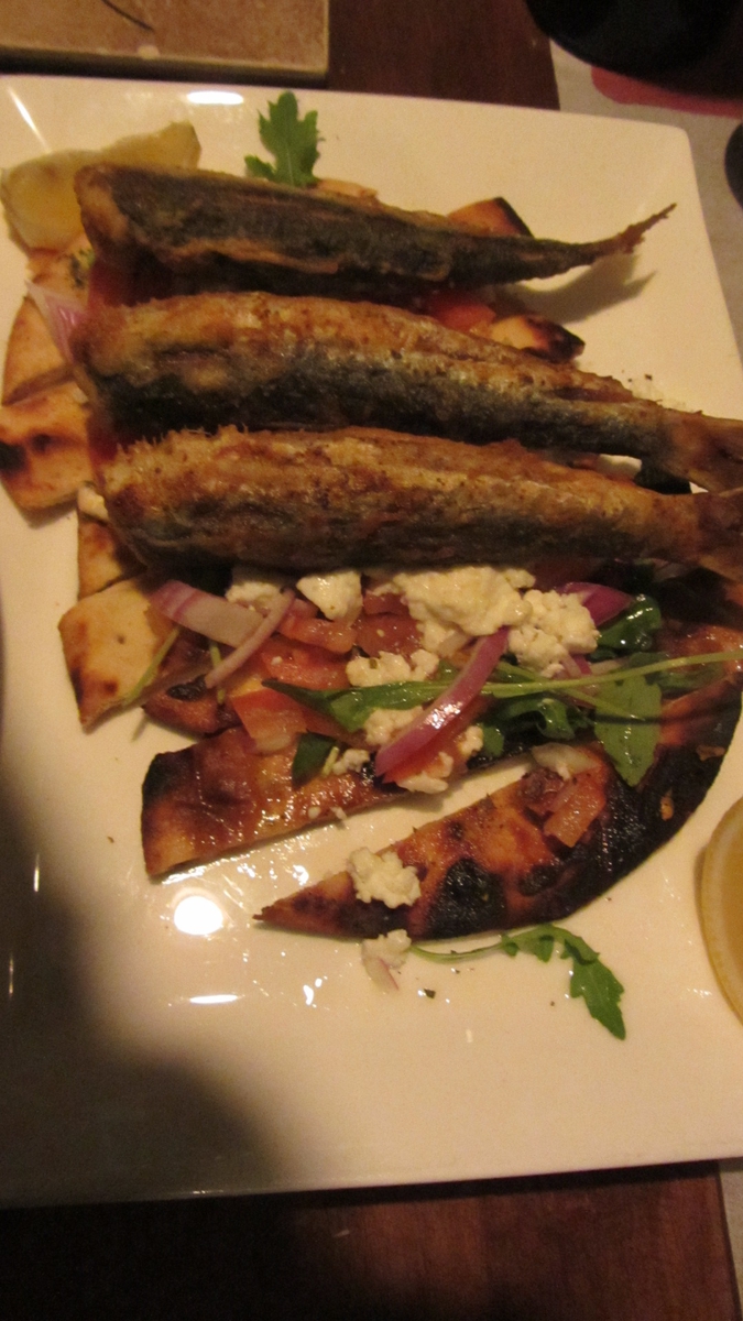 The kitchen is open so we could see the teamwork of the staff. The waitress recited the specials. I was so happy to hear that they source their fresh fish from Peter’s Fishery, the same store where I get my fish at home. A major plus for me. Also their chicken special was organic and beautifully plated with fresh herbs galore. The chef/owner sent out a tray of Pikilia for us, which included many different interesting dips: Taramosalata (red caviar dip), feta cheese with olive oil and oregano, Tyrokafteri (spicy feta cheese dip), incredible hummus, and Melitzanosalata (the classic eggplant dip)—wonderfully smoky and delicious, served with grilled pita bread and olives.