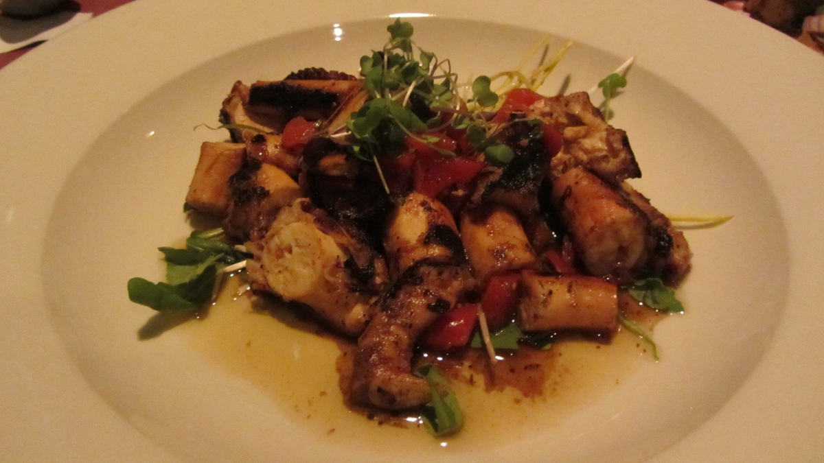 The menu is broken into bowls, plates, butcher selection, and sides. The bowls refer to the various ramen noodle dishes featuring noodles by award-winning Sun Ramen. The options range from A Hen Full ($13) – chicken meatballs, dashi and shoyu broth to the popular Nose to Tail ($15) – pork belly, crispy pig ears, seared heart in sofrito shoyu broth. Plates are just that, entrée-size dishes with a selection of interesting ingredients that I look forward to discovering on future visits. Some of the favorites are the whole grain mustard spaetzle ($14) – bone marrow and pork ragu with confit tomatoes and the warm octopus salad ($14) – fingerling potatoes, chorizo, frisée and cherry tomatoes. Butcher selections are meat cuts from the butcher case and offered at market pricing with two sides. The sides are scalloped potatoes ($10), market vegetables, forchette potatoes, and baby green salad (each $8).