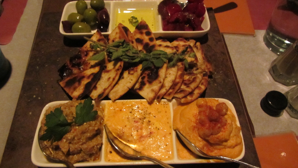 We didn’t look back. From the minute we walked in, the service at A Taste Of Greece was outstanding, the food was spectacular and the chef/owner,Themis Mourelatos, greeted us with his usual big wide grin. The Greek music played in the background, every table was set with fresh flowers, they opened our wine and immediately brought out a special appetizer dip tray with fresh warm pita bread.
