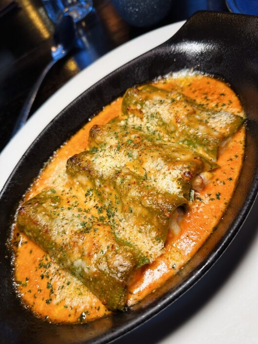 Menu item: Cannelloni Business: Luca’s Ristorante Location: Somerset @tipsycritic says: “This was a unique pasta dish! Spinach-infused cylindrical pasta stuffed with lobster/mascarpone brandy tomato cream sauce. I suggest washing it down with your favorite pinot noir at this cozy BYOB.”