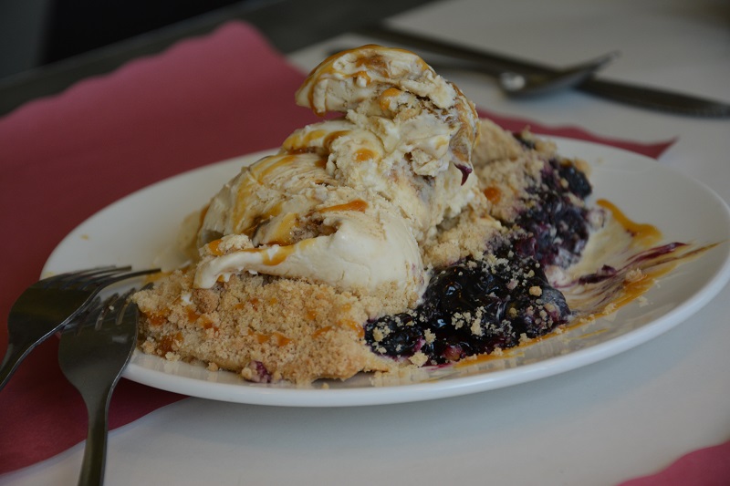 We enjoyed a delicious meal and superb coffee. Julie ordered a grilled cheese sandwich with bacon. I started off with a cup of Manhattan clam chowder and sprung for a daily special: shrimp salad on a roll with bacon, avocado, fresh spinach, and tomato slices. Just couldn’t resist five of my faves stuffed into one delightful sandwich. Every bite was a treat, a rich blend of textures and flavors. Blueberry crumb pie with vanilla ice cream and sea salt caramel syrup was the topper for the meal; a bit indulgent for sure, but certainly appropriate for the occasion.