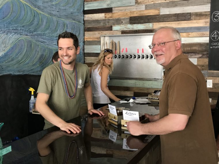 Besides the beach theme (Bert and Nick are surfers after all), you will notice that Last Wave’s taproom has a homemade feel to it. That’s because it is. The beautiful handmade wooden logo, the clever tasting flight crates—much more sensible than those precarious paddles—and the repurposed pallet wood paneling were all done by either Bert and Nick, or friends and family. Dani, Bert’s wife, is the tap room manager and was responsible for the layout. Make sure you check out the surfboard art and, if you’re an artist yourself, ask about displaying your work in the mini gallery. Light and airy, Last Wave is a board-shorts-and-flip-flops kind of place.