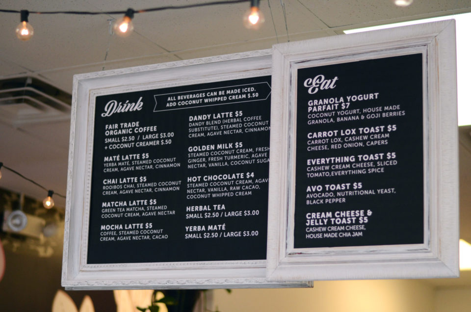 Vegan or not, there is something for everyone at the new bakery. Seed to Sprout Bakery offers indulgent cookies, cinnamon rolls, and other snacks, like toasts with avocado or carrot lox. They also serve a variety of coffee, hot chocolate, and tea. As I’m photographing the space, some customers come in. One of the men says, “You should put ‘Coffee and Bakery’ on the sign,” and goes on to rave about how much he likes their coffee. And, of course, they do custom cakes for weddings and parties. “These are the healthiest cakes you can probably get,” Cara tells me—but it’s still a cake. They laugh as they recall how many customers are suspicious of their baked sweets, calling to place orders and asking if the cake would taste good.