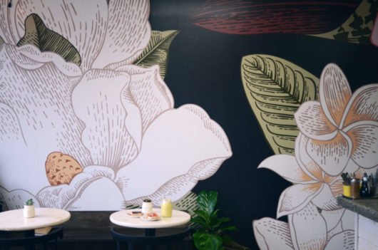 In March, their dream came true as they held the grand opening for the Seed to Sprout Bakery, located on Wickapecko Drive in Wanamassa, a quiet section of Ocean Township close to Route 35 and Asbury Park. It’s a beautiful, light-filled space, even when I visit on a rainy April morning. Custom designed wallpaper covers half of the space: giant, Instagram-worthy blooms. The decor is simple but not at all boring, kind of like the food produced here.