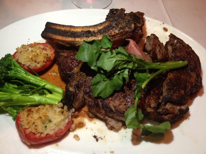 For our entrées, we opted for the nightly specials – Dover Sole and Lasagna Bolognese and the 28-ounce Prime Rib Chop “The Ultimate Cowboy Steak” ($40) and Rack of Lamb Brushed with Mustard and Breadcrumbs ($30). The Dover sole is served whole and presented to the table before being expertly fileted and served by the wait staff. It’s light and moist and served with a lemon, garlic butter sauce that’s a bit addicting. The lasagna featured a flavorful tomato sauce and served in a sizeable portion. The aroma that exuded from the cowboy steak as it was brought to the table would have caused any red blooded carnivore to glaze over with beefy lust. While it was more medium-well than medium-rare, the 30-day aged meat was rich and decadent. The rack of lamb was beautifully cooked to a slightly charred exterior and a rare interior. Both the steak and lamb are served with baked plum tomatoes with breadcrumb topping – classic all the way.